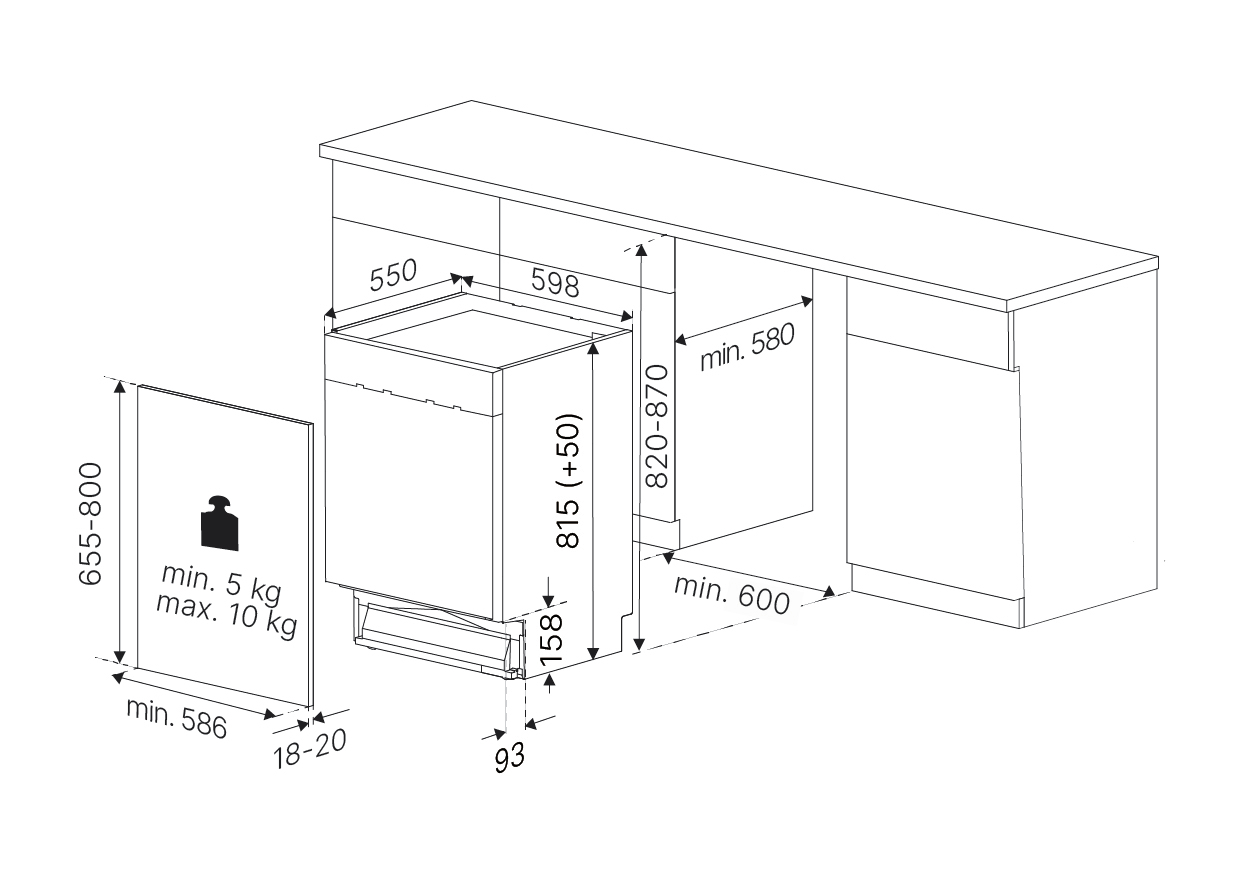 - Размеры прибора Ш х В х Г ≈ 598 x 81-5865 x 550 мм